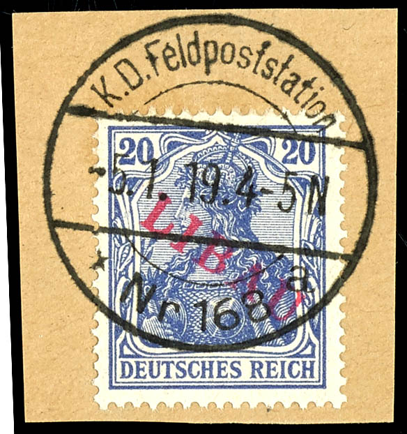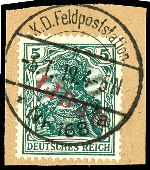 Germania dunkelviolettblau mit rotem Aufdruck \LIBAU\ in Type II, gestempelt \Deutsche Feldpost * 168 a 6.1.19\ auf Briefstück, tadellose Erhaltung, Auflage nur 500 Stück, geprüft Mikulski, Mi. 80.-