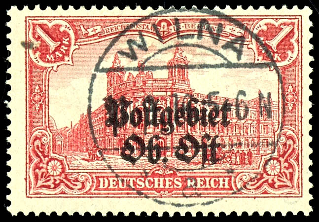 1 Mark German Reich with overprint \postal area whether. east\, 26 : 17 perforation holes, used Vilnius, very fine, photo expertize Heinrich Wasels BPP \perfect (12A) Certificate 1 Mark Deutsches Reich mit Aufdruck \Postgebiet Ob. Ost\, 26 : 17 Zähnungslöcher, gestempelt WILNA, tadellose Erhaltung, Fotobefund