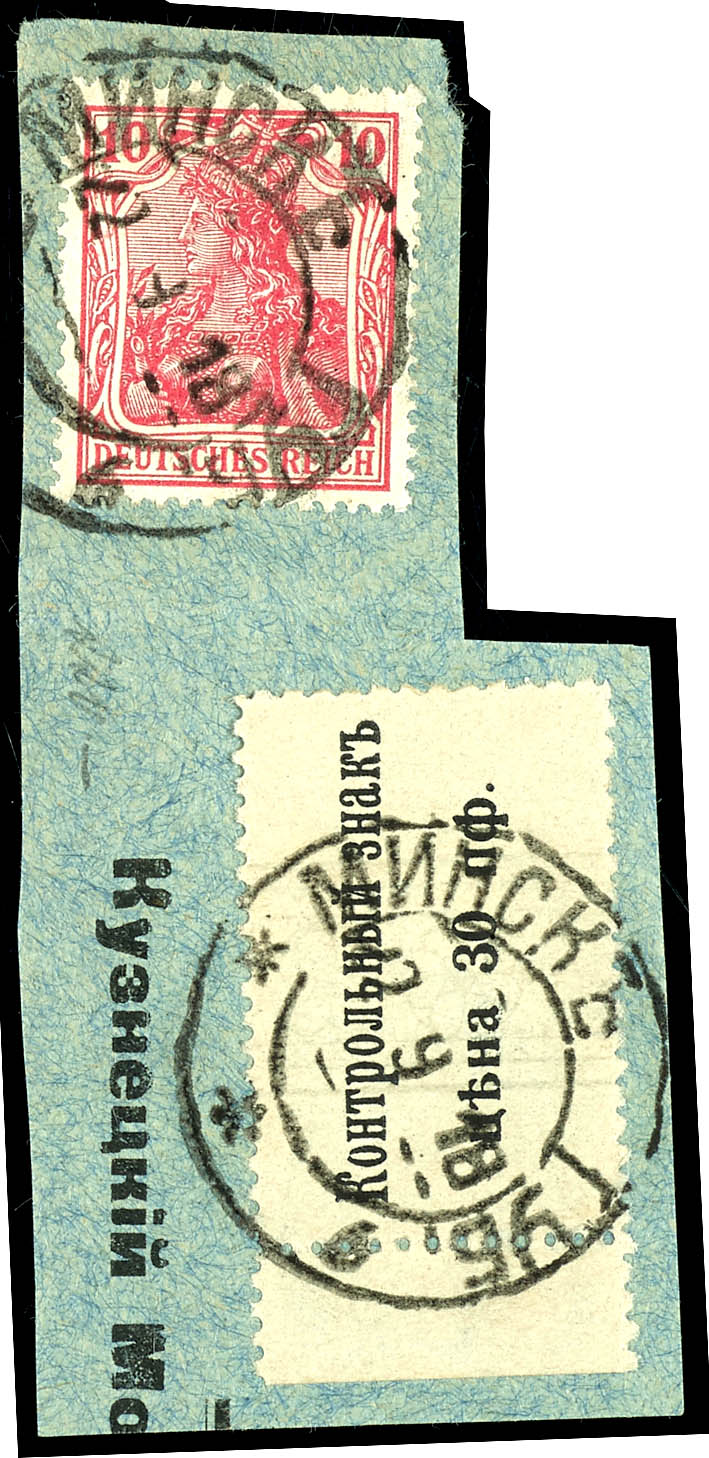 Certificate 1 Mark Deutsches Reich mit Aufdruck \Postgebiet Ob. Ost\, 26 : 17 Zähnungslöcher, gestempelt, \LIBAU 27.10.16 9-10V\ auf Briefstück,