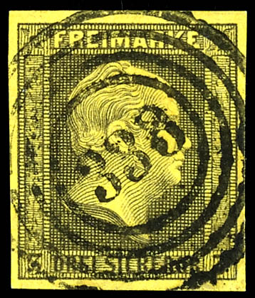 \349\ - Drossen (administrativ district of Frankfurt), clear on 3 silver penny black on yellow, very fine (4a) \349\ - Drossen (Reg.-Bez. Frankfurt), klar auf 3 Silbergroschen schwarz auf gelb, tadellose Erhaltung