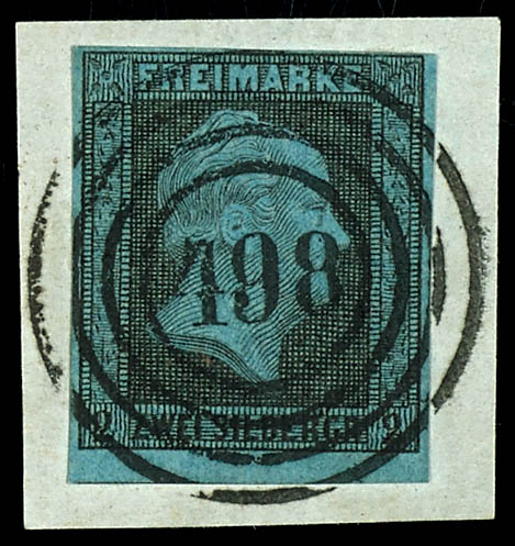 \498\ - Gnadenfeld (administrativ district of Opole), clear on 2 silver penny black on blue on piece, very fine (3) \498\ - Gnadenfeld (Reg.-Bez. Oppeln), klar auf 2 Silbergroschen schwarz auf blau auf Briefstück,