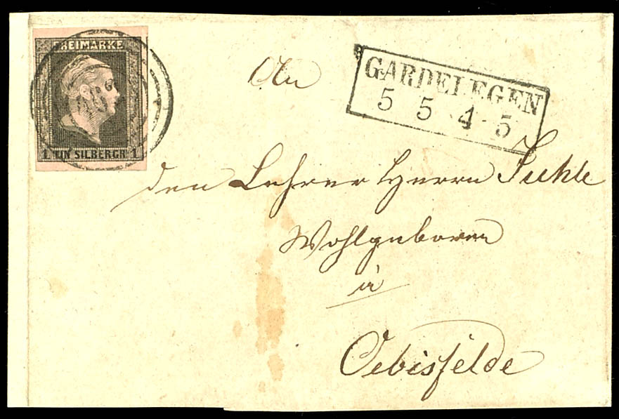 Gardelegen (Reg.-Bez. Magdeburg), klar auf 1 Silbergroschen schwarz auf rosa auf Brief mit nebengesetztem Orts-Ra2 \GARDELEGEN 5 5 4-5\, adressiert nach Oebisfeld, tadellose Erhaltung