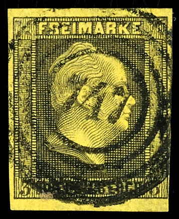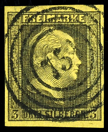 \743\ - Koenigshuette (administrativ district of Opole), clear on 3 silver penny black on yellow, very fine (4a) \743\ - Königshütte (Reg.-Bez. Oppeln), klar auf 3 Silbergroschen schwarz auf gelb, tadellose Erhaltung