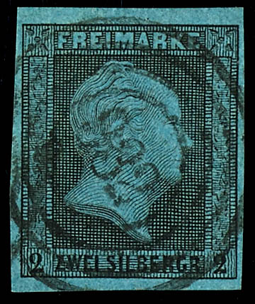 \917\ - Huertgen (administrativ district of Aachen), II. distribution, clear on 2 silver penny black on blue, very fine (3) \917\ - Hürtgen (Reg.-Bez. Aachen), II. Verteilung, klar auf 2 Silbergroschen schwarz auf blau,