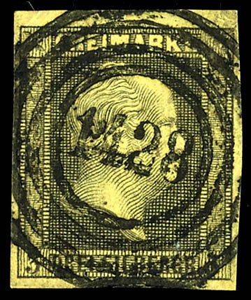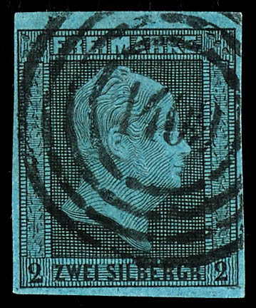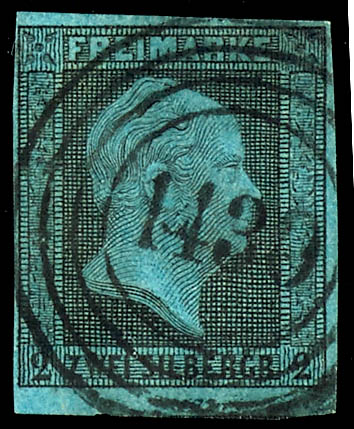 particular stamp the cancel locality unidentifiable is. (3) \1430\ - Waldböckelheim (Reg.-Bez. Koblenz), klar auf 2 Silbergroschen schwarz auf blau, tadellose Erhaltung, der Nummernstempel 1430 war doppelt vergeben, wir haben die niedriger