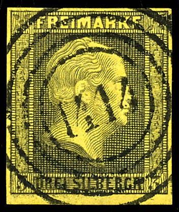 \1428\ - Stassfurt (administrativ district of Magdeburg), clear on 3 silver penny black on yellow, very fine (4a) \1428\ - Staßfurt (Reg.-Bez. Magdeburg), klar auf 3 Silbergroschen schwarz auf gelb, tadellose Erhaltung