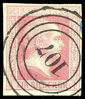 107 - Berlin, Postal Dispatch No. 4 (Administrative District of Potsdam), clear and centrally struck on a 1 silver groschen in pink, smooth background, flawless condition. (6a) \107\ - Berlin, Post-Sped. Nr.4 (Reg.-Bez.