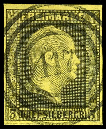 117. Beuel (Administrative District of Cologne), clear and centrally struck on a 3 silver groschen black on yellow, excellent condition. (4a) \117\ - Beuel (Reg.-Bez. Köln), klar und zentrisch auf 3 Silbergroschen schwarz