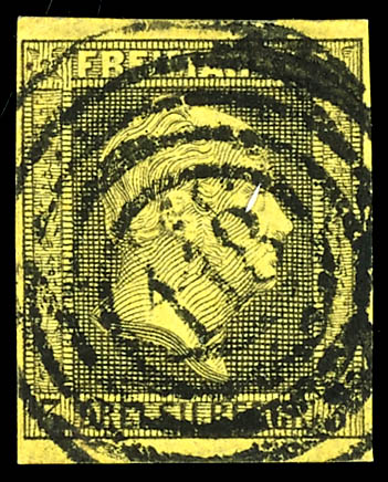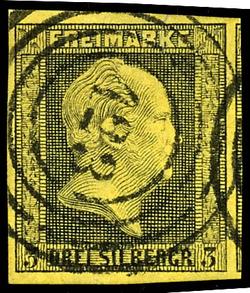 123 - Bialla (Administrative District of Gumbinnen), clear and centrally struck on a 3 silver groschen black on yellow, excellent condition. (4a) \123\ - Bialla (Reg.-Bez. Gumbinnen), klar und zentrisch auf 3 Silbergroschen