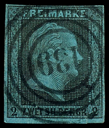 131 - Birkenfeld (Administrative District of the Principality of Birkenfeld), clearly struck on a four-margined 2 silver groschen black on blue, excellent condition. (3) \131\ - Birkenfeld (Reg.-Bez. Oldenburgisches
