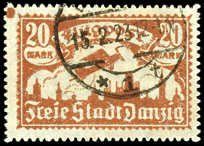 100 + 30 Mark Kleinrentnerhilfe, postmarked \DANZIG * 5 g 30. 3. 23 4-5 N\, with printing error II \lower crown in the upper left shield on the left side open (Field 43)\, expertized by Dr. Oechsner and INFLA round stamp,