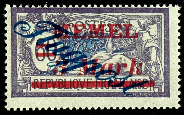 40 Pfennig on 20 Centimes, with an additional, shifted and inverted overprint \60\ in black ultramarine, postmarked \MEMEL * * c 29. 9. 21 10-11 V\, photo certificate by Tobias Huylmans (2021), corner perforation flaw on the