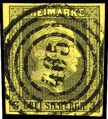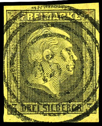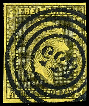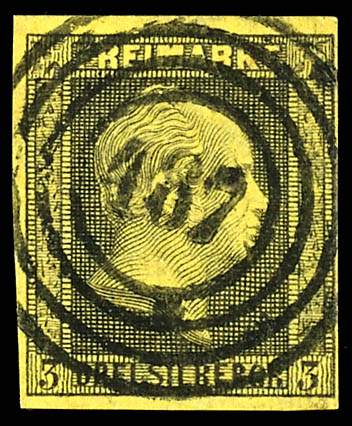 465 - Garz (Administrative District of Stralsund), clear and centrally struck on a 3 silver groschen black on yellow, flawless condition. (4a) \465\ - Garz (Reg.-Bez. Stralsund), klar und zentrisch auf 3 Silbergroschen