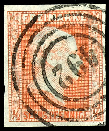 Illustrated piece in the Krauss handbook, Lot 1638 of the 153rd Rauhut Auction. (1) \492\ - Glehn (Reg.-Bez. Düsseldorf), klar und zentrisch auf ½ Silbergroschen rotorange, Eckbug . sonst tadellose Erhaltung, seltener Stempel - vor allem in