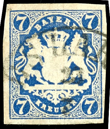 7 Kreuzer preußischblau, Staatswappen auf Sockel (III), breit- bis überrandig geschnittenes und farbfrisches Exemplar, oben noch Teile der Nebenmarke zeigend, entwertet mit Halbkreisstempel \....ELHEI..13/9\, tadellose Erhaltung, geprüft Pfenniger und Drahn, Fotoattest Maria Brettl AIEP (2024) \In feiner, tadelloser Erhaltung. Frische leuchtende Farbe der seltenen Nuance.\, Mi. 1.000.-
