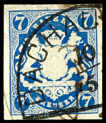 7 Kreuzer preußischblau, farbfrisches und vollrandiges Kabinettstück, entwertet mit Halbkreisstempel DACHAU 10/5 und schwacher Federzug, Fotoattest Maria Brettl AIEP \in feiner, tadelloser Erhaltung.\