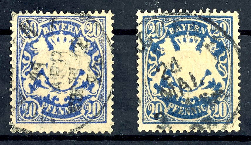 20 Pfennig mit Zähnung B, c- und d-Farbe, gestempelte Bedarfsstücke, geprüft Bauer BPP