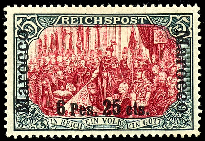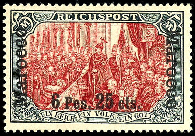 5 Mark with overprint \Marocco 6 Pes. 25 Cts.\, rare type with plate flaw I, mint, flawless, photo certificate Michael Jaeschke-Lantelme BPP, Michel -, - (19I/IIPFI) Certificate 5 Mark mit Aufdruck \Marocco 6 Pes. 25 Cts.\, seltene Type mit Plattenfehler I, ungebraucht, einwandfrei, Fotoattest Michael
