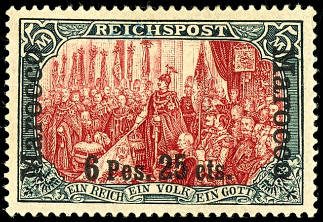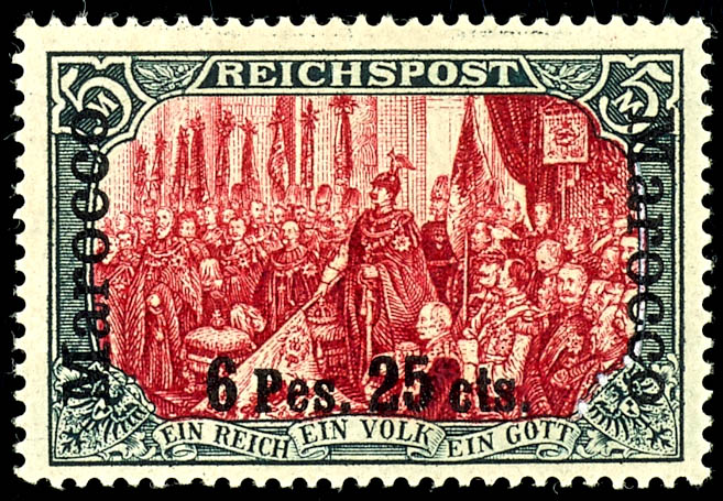 6 Pes. 25 Cts. on 5 Mark, rare type with printing error II, mint never hinged with original gum, short perforation on the left, otherwise flawless condition, extremely rare, photo certificate Michael Jaeschke-Lantelme BPP,