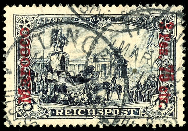 5 Mark green-black / brownish-carmine, Type I with overprint only in white, used, excellent condition, Michel 700,- (19I/IV) 5 Mark grünschwarz/bräunlichkarmin, Type I mit Nachmalung nur mit Deckweiß, gestempelt,