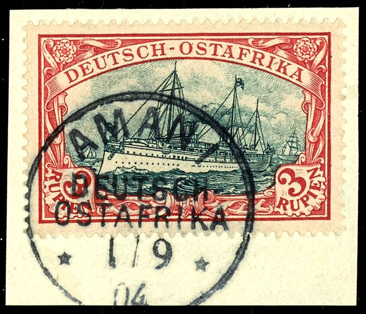 3 Rupees Kaiser yacht dark red / green black, tied \AMANI 1 / 9 04\ on a postal fragment, flawless condition, photographic evidence Michael Jaeschke-Lantelme BPP \in flawless condition.\ (21b) Certificate 3 Rupien Kaiseryacht dunkelrot/grünschwarz, entwertet \AMANI 1/9 04\ auf Briefstück, tadellose Erhaltung, Fotobefund Michael