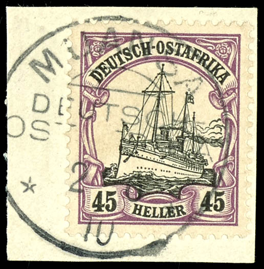 45 Heller Kaiseryacht, red-violet / black, tied \MUANZA 2 / 6 10\ on a piece of letter, excellent condition. (28b) 45 Heller Kaiseryacht, rotviolett/schwarz, entwertet \MUANZA 2/6 10\ auf Briefstück, tadellose Erhaltung