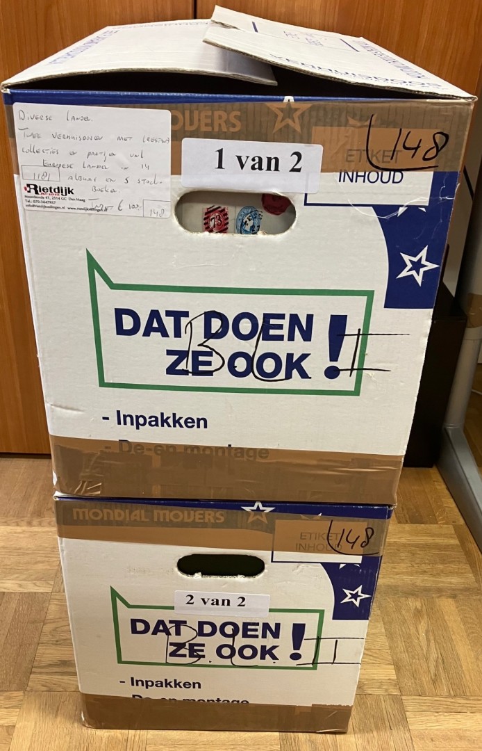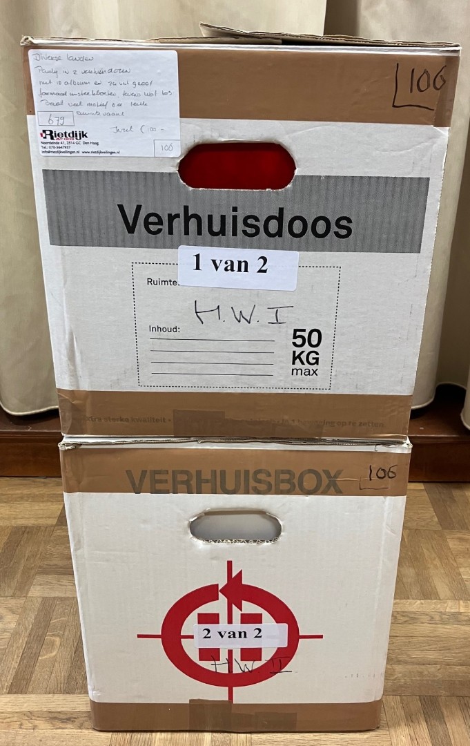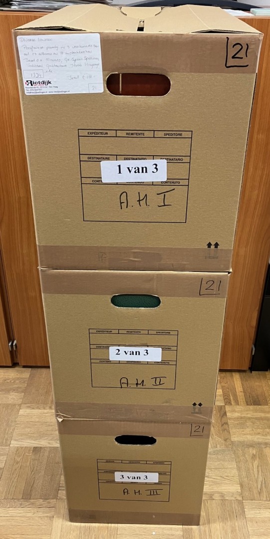 LANDEN. Twee verhuisdozen met 34 stockboeken of albums en wat los materiaal. Bevat o.a. motief, w.bij ruimtevaart. Click this link for additional images and
