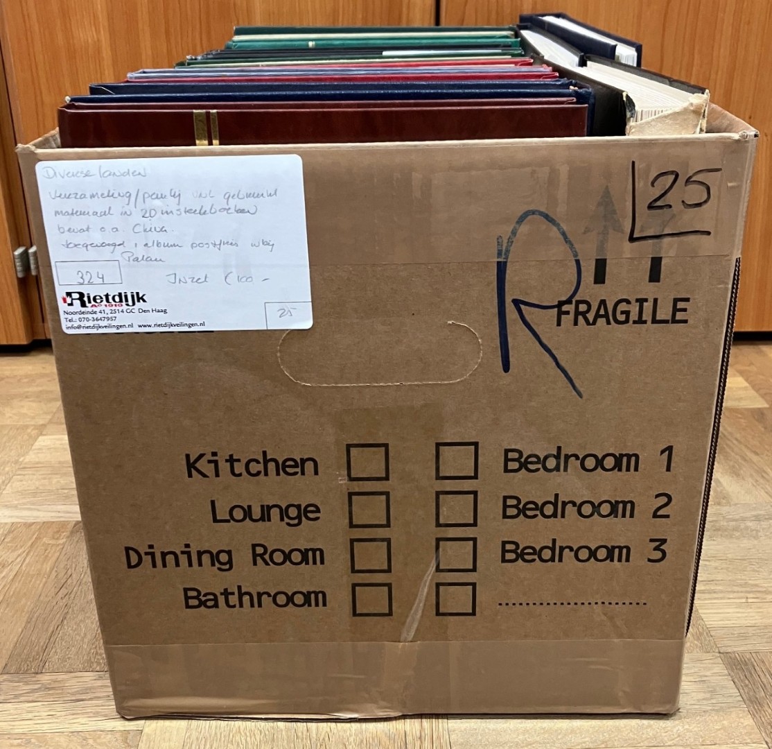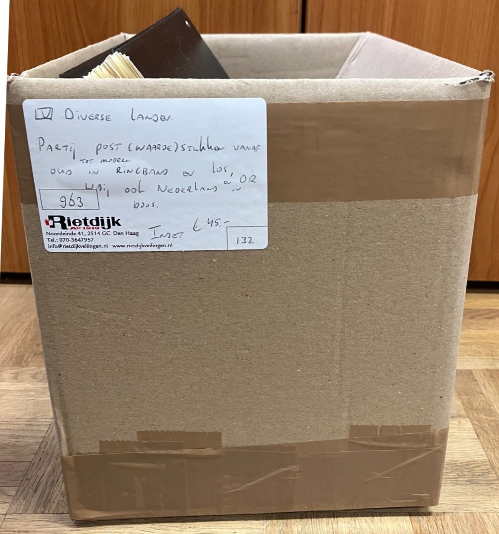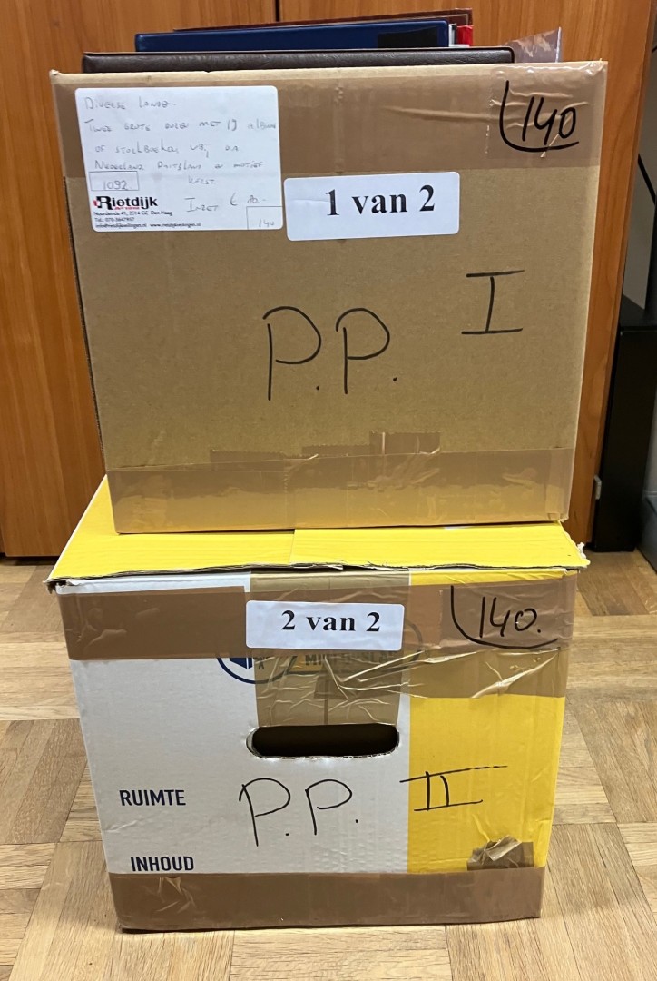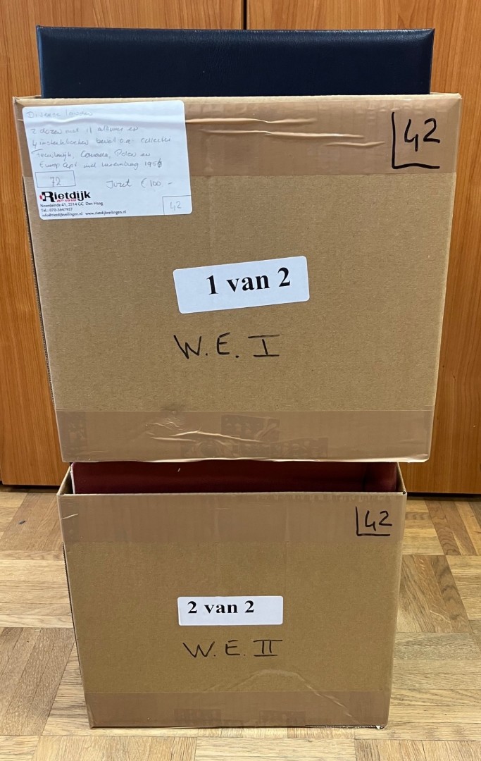 Twee verhuisdozen met 26 stockboeken of ringbanden en wat los materiaal. Bevat o.a. Overzeese Rijksdelen en covers Jaar van het Kind. Click this link for additional images