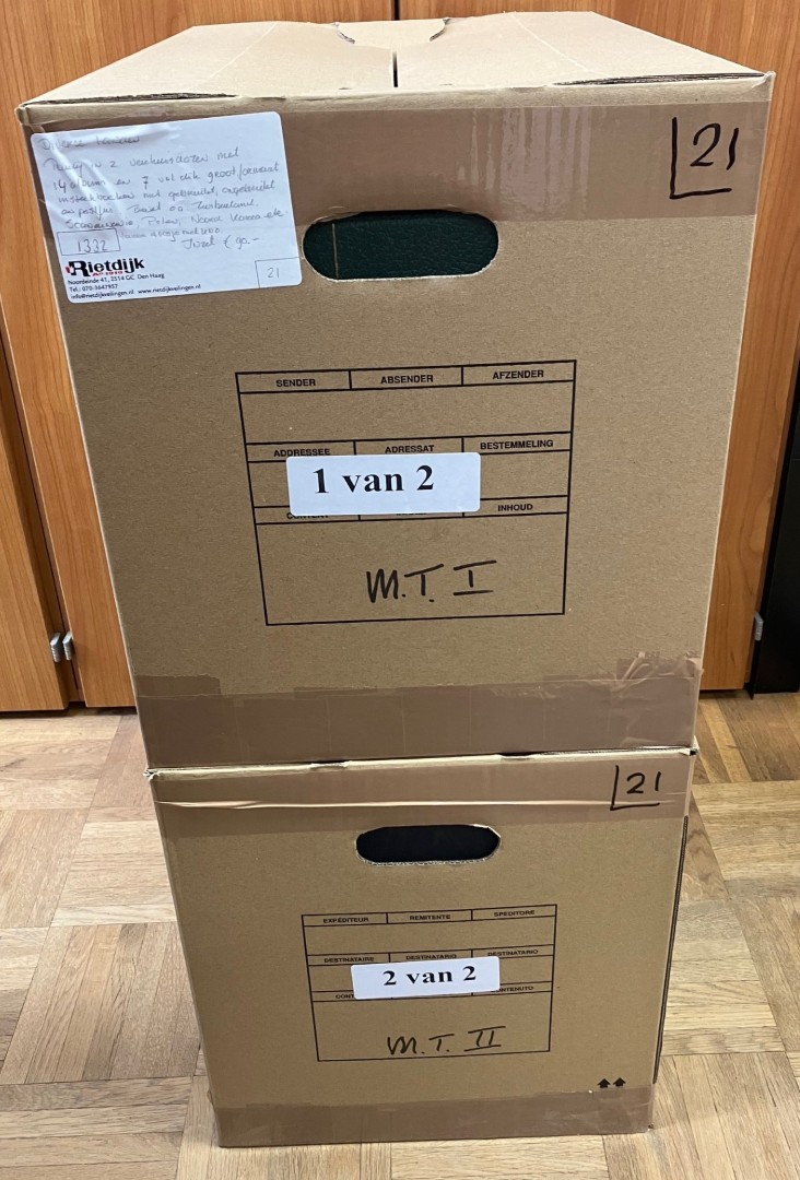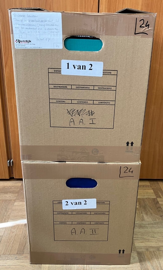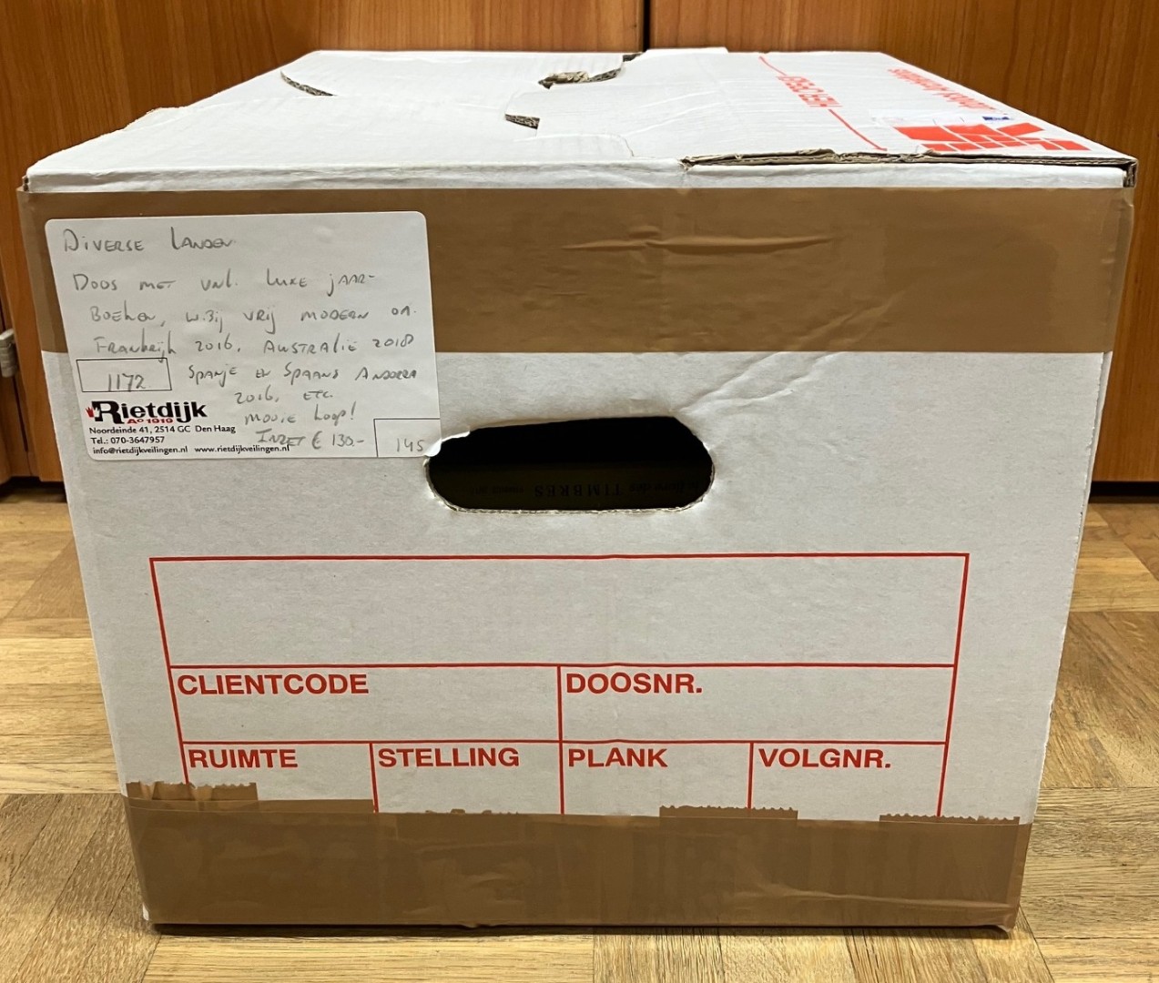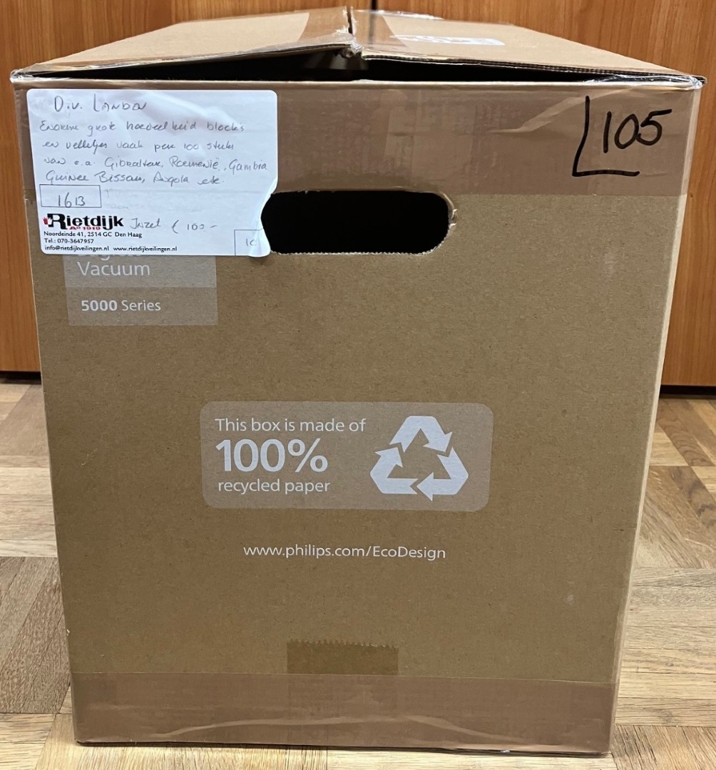 Twee verhuisdozen met 26 stockboeken of ringbanden en wat los materiaal. Bevat o.a. Overzeese Rijksdelen en covers Jaar van het Kind. Click this link for additional images