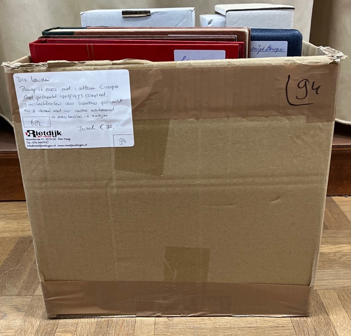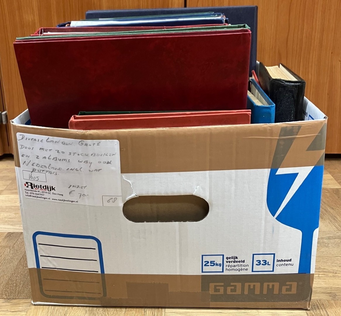 LANDEN. Twee grote dozen met 19 albums of stockboeken, w.bij o.a. Nederland, Duitsland en motief kerst. Click this link for additional images and