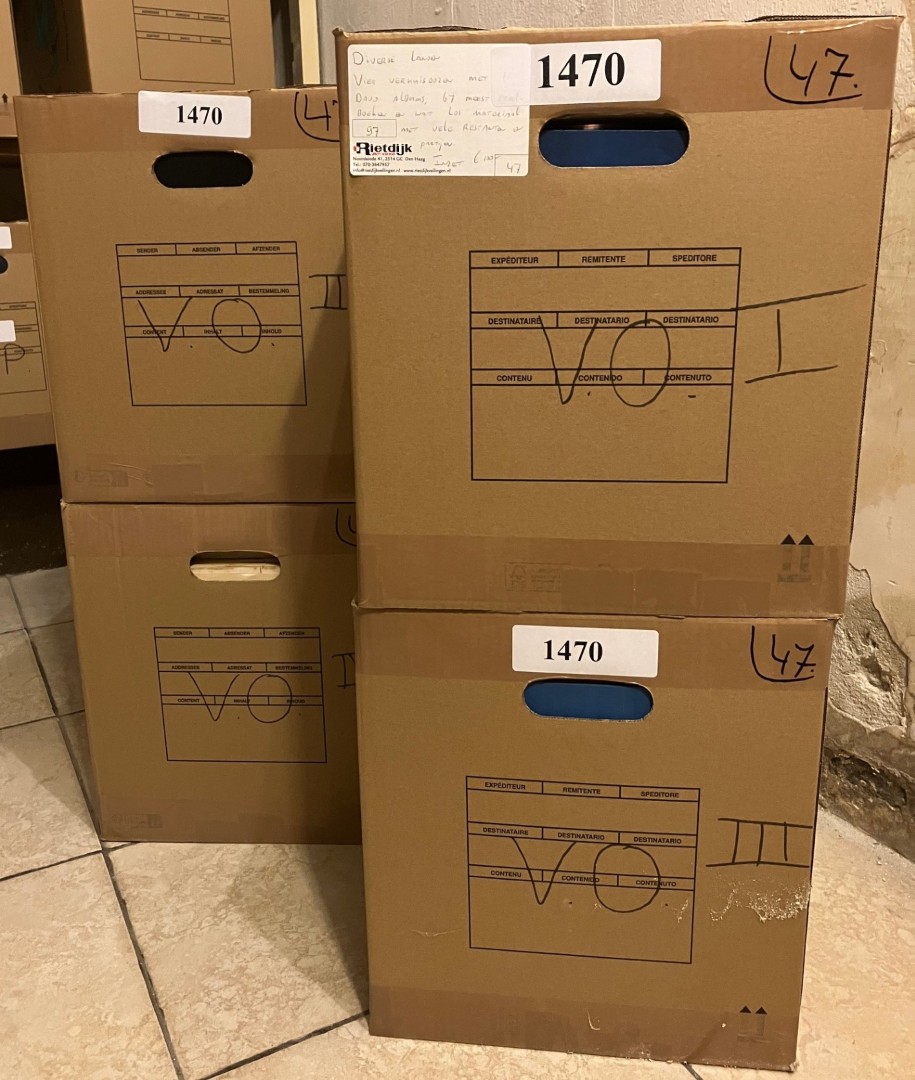 Vier verhuisdozen met vele restanten en partijen in 11 Davo albums, 67 meest stockboeken en schoenendoos rondzendboekjes. (Image)