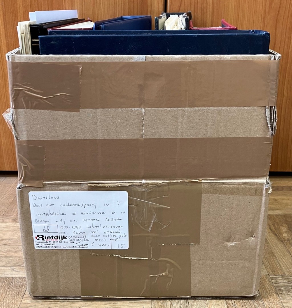 met collectie/partij in 7 insteekboeken of ringbanden en op bladen, w.bij o.a. bezette gebieden 1939-1945, lokaaluitgaven, etc. Bevat veel opdrukmateriaal gelieve zelf beoordelen. Mooie koop! (Image)