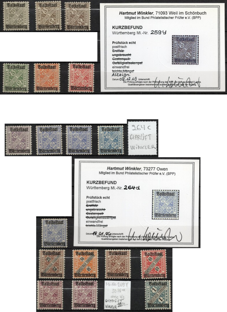 (WÜRTTEMBERG) [1919]. Samenstelling dienstzegels Mi. nr. 258 t/m 270 ongebruikt/postfris op insteekkaart, w.bij varianten o.a. nr. 259y en 264d, beide met attest.