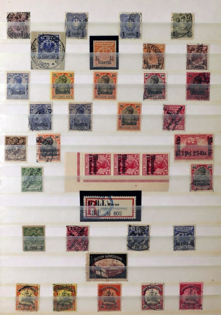 2168 imageDUITSLAND (KOLONIËN EN BEZETTE GEBIEDEN). Verz. in dik insteekboek, w.bij beter materiaal. Tevens stadspost en wat cinderella's.