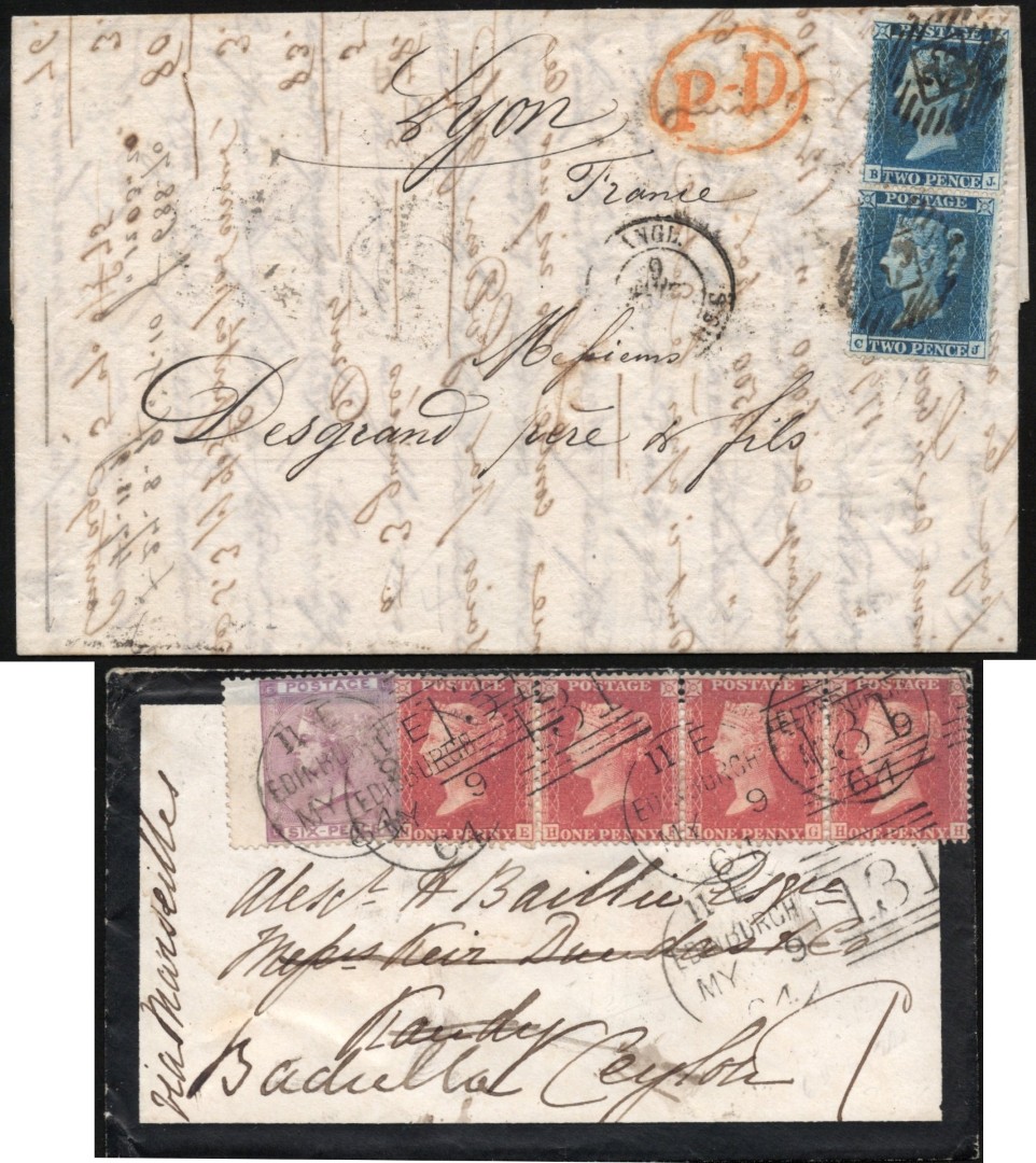 260 imageGREAT BRITAIN. Map met vouwbrief met nr. 19, tanding 16 in verticaal paar van Londen 1855 naar Lyon, Frankrijk alsmede envelop met One Penny in strip van 4 + Six Pence van Edinburgh d.d. My 9 '64 naar Ceylon.