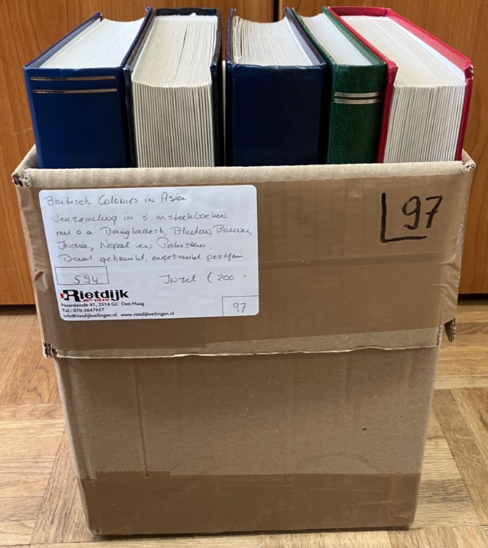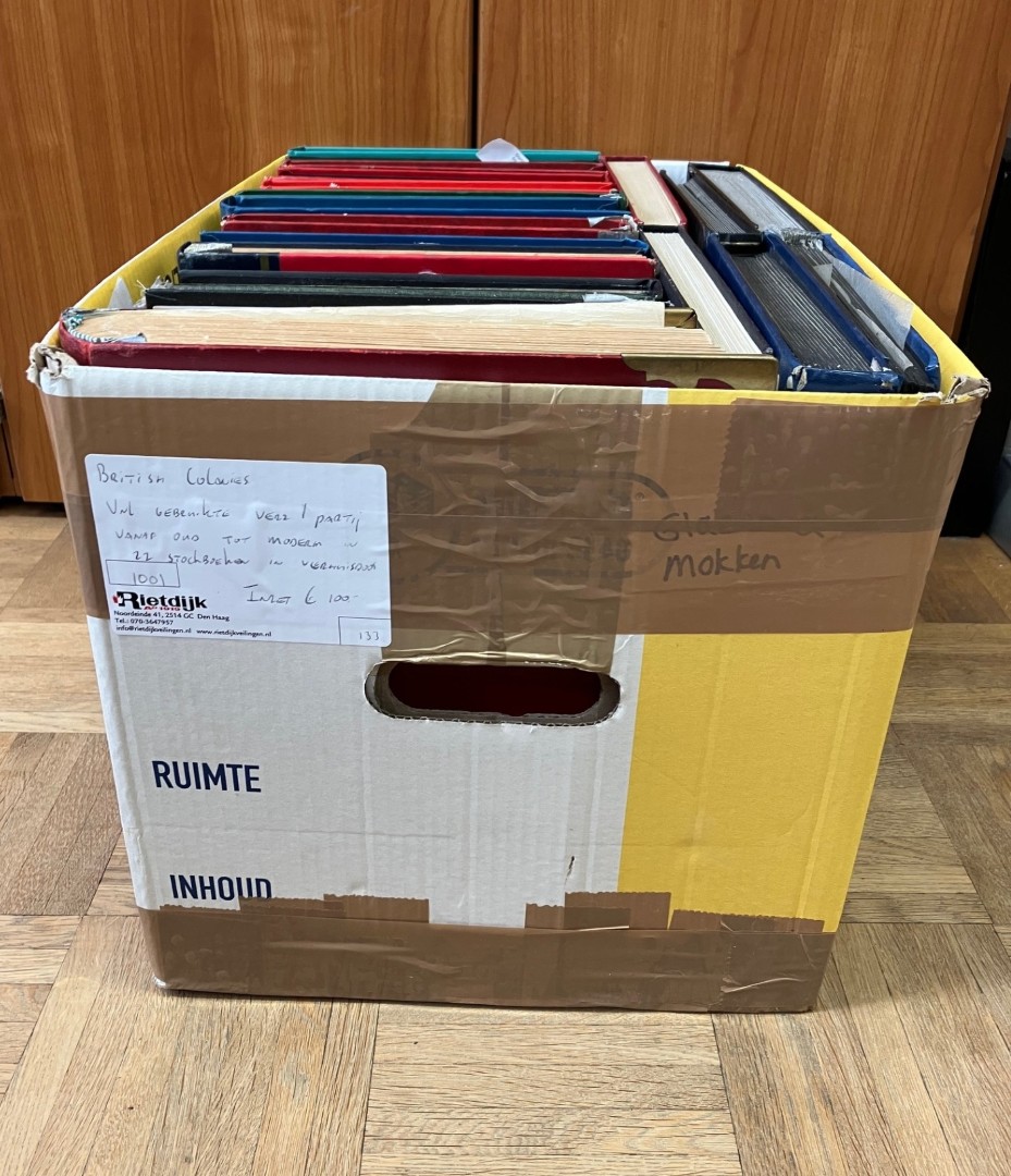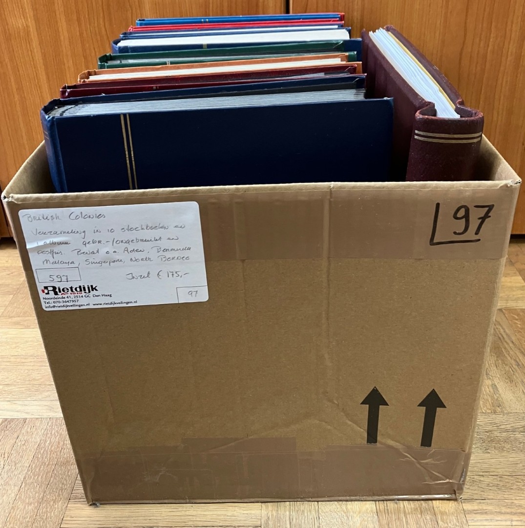 COLONIES. Verhuisdoos met 17 stockboeken of albums met gebr./ongebruikt en postfris, w.bij aardige verz. Australië, India vanaf oud, Pakistan, etc. Click this link for