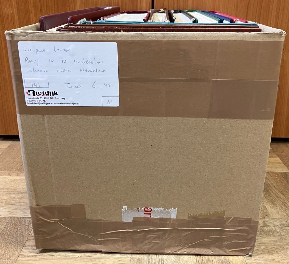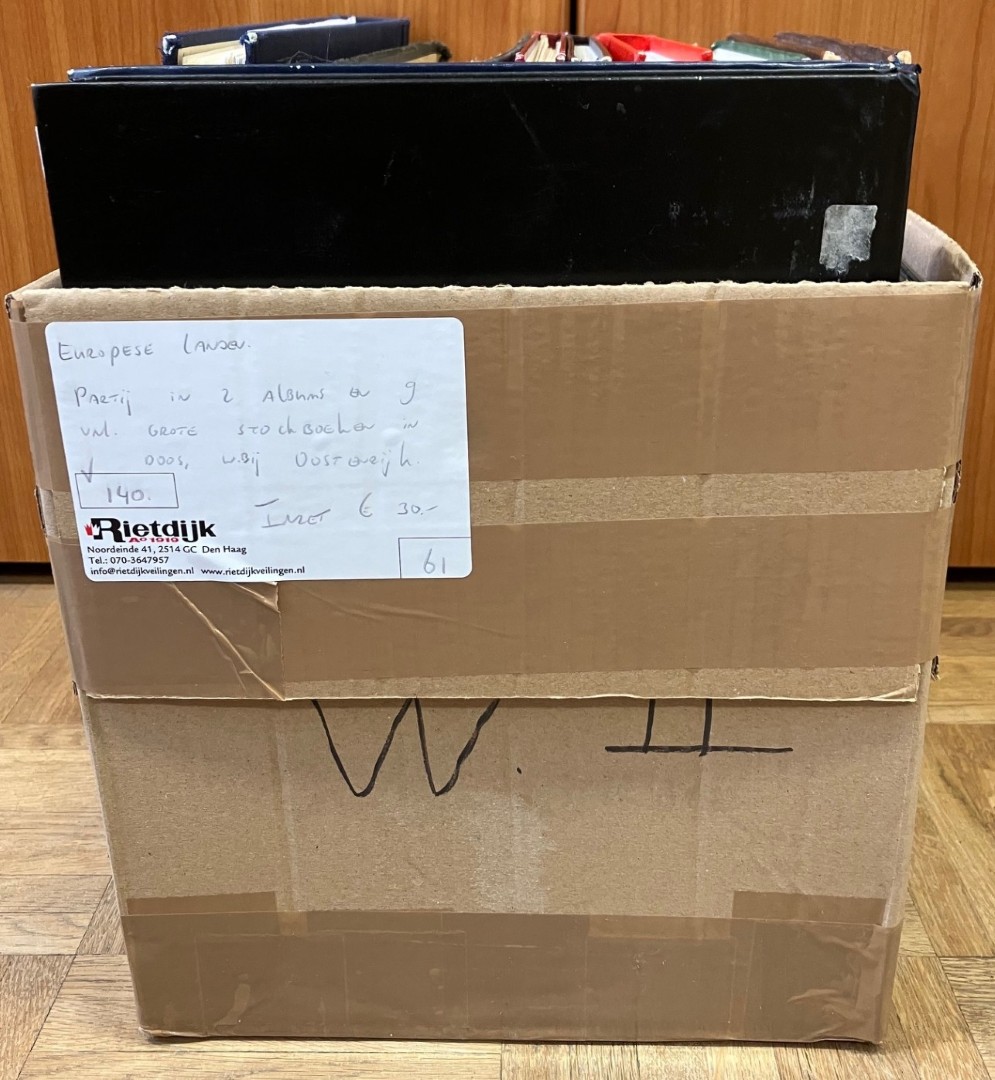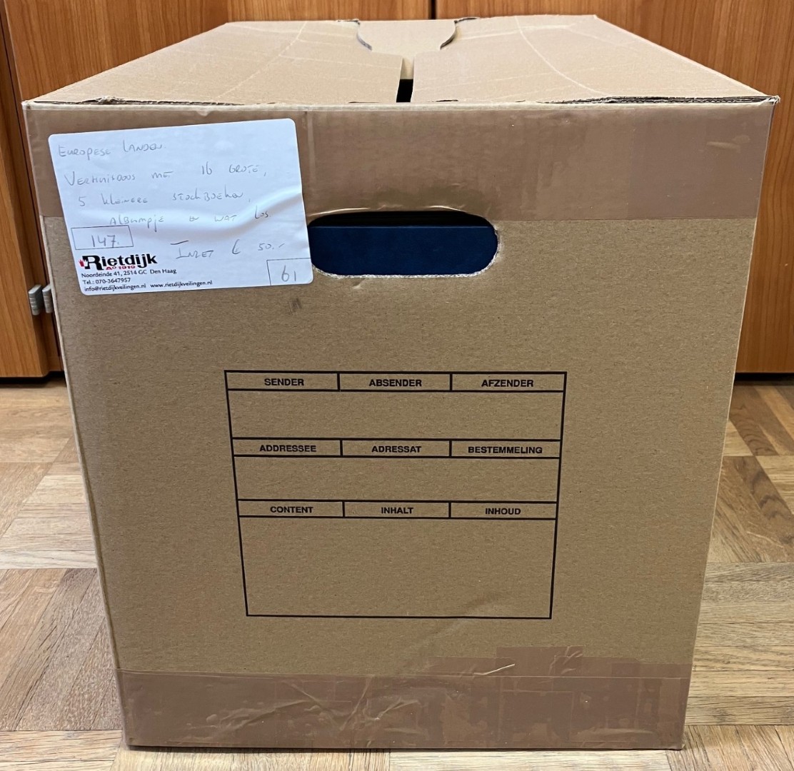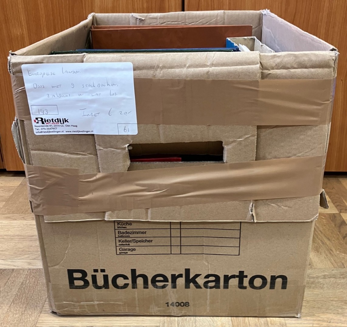 1526 imageEUROPESE LANDEN. Verhuisdoos met 16 grote en 5 kleinere stockboeken alsmede albumpje en wat los.
