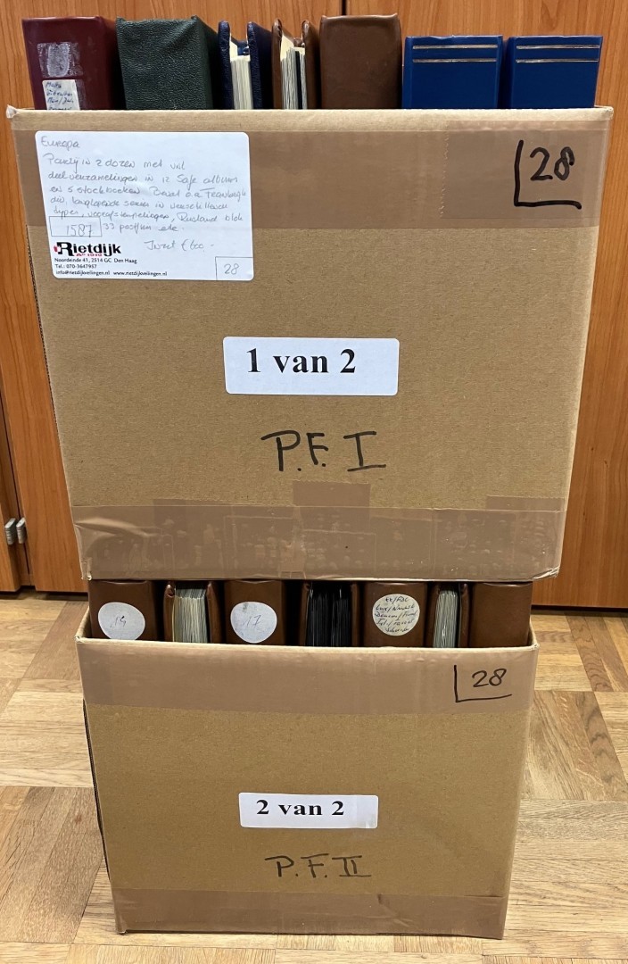 1391 imageEUROPESE LANDEN. TWEE GROTE DOZEN MET COLLECTIES, RESTANTVERZAMELINGEN EN BLOCKS IN 12 SAFE ALBUMS EN 5 STOCKBOEKEN. BEVAT O.A. VEEL FRANKRIJK EN OOSTENRIJK MAAR OOK RUSLAND/SOWJET UNIE. LEUKE KOOP!