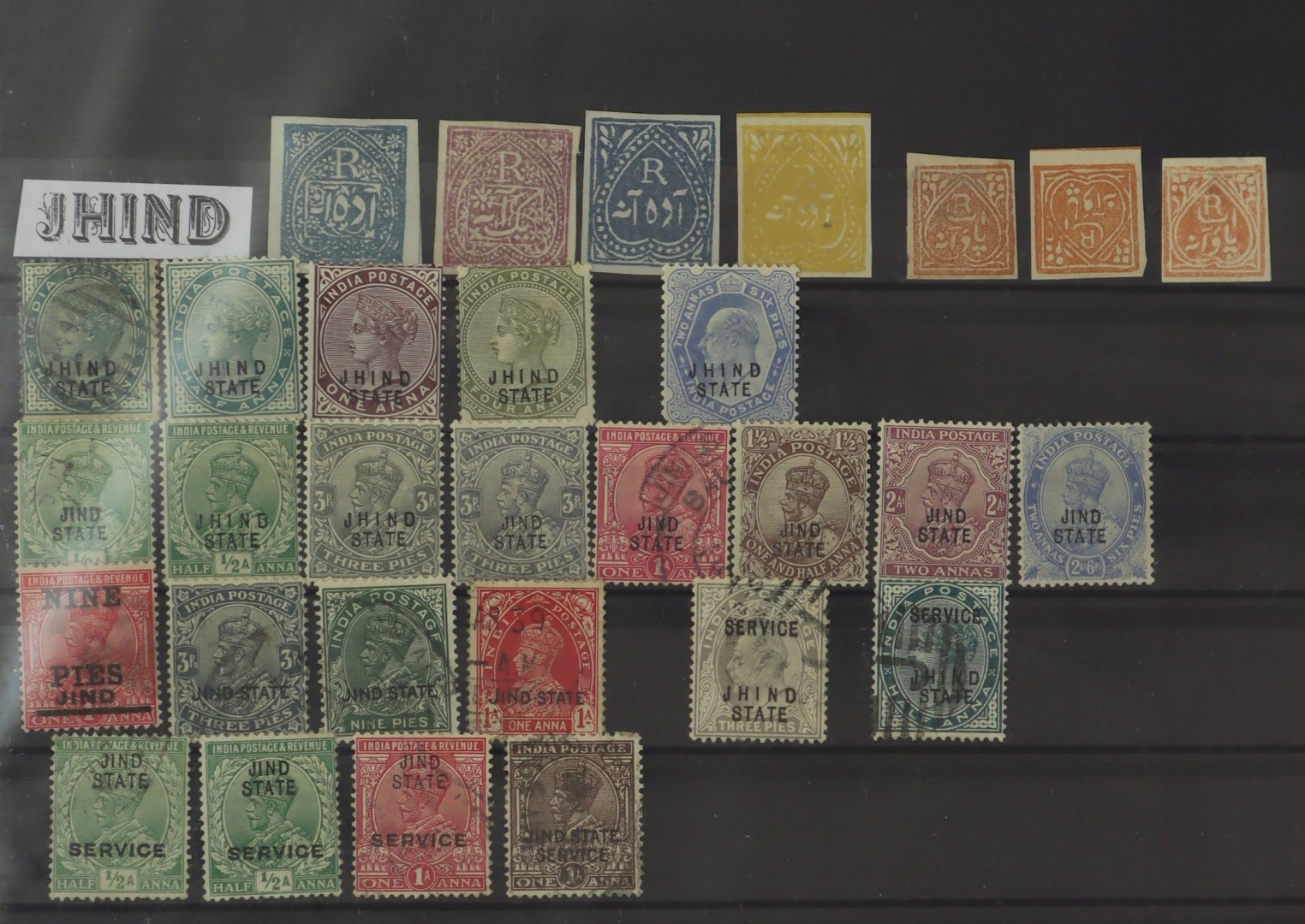 2247 imageINDIAN FEUDATORY AND CONVENTION STATES. Verz. van Alwar t/m Travancore gebr./ongebruikt in dik insteekboek. Tevens stockboek diverse.