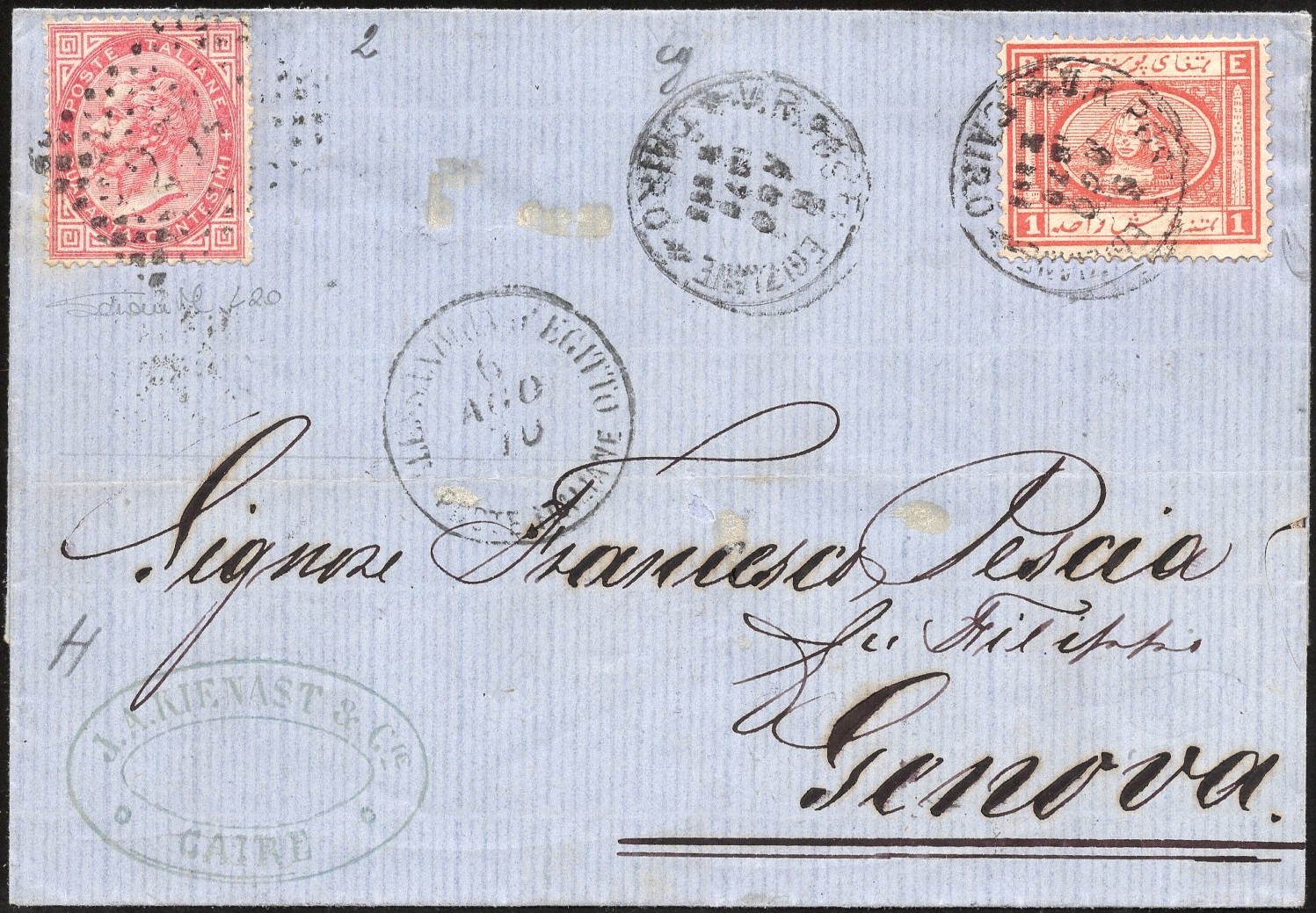 2021 imageWrapper from Cairo to Genova franked with 1 Piaster Yvert no. 13 shipped over the Italian P.O. in Alexandria were the 40 Centisimi Yvert no. 39 was placed and cancelled with the postmark no. 234 in points. D.o.a. Genova 15-8-70. Very fine and scarse envelope. With photocertificate Sorani (2023).
