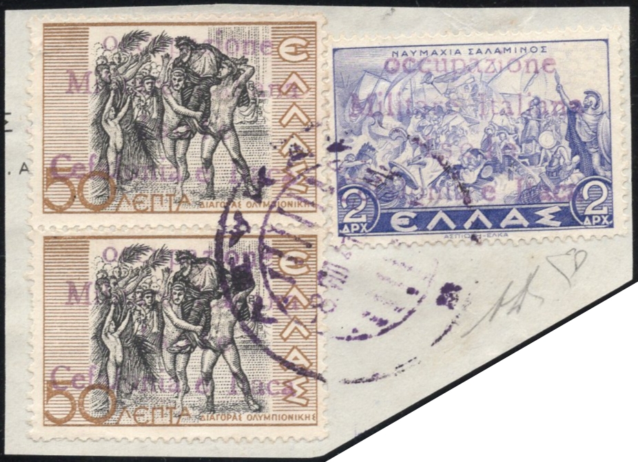 2022 imageViolet overprint Sassone no. 8A (2x) and no. 10A together on fragment. With photocertificate A. Diena (1955). (Image)