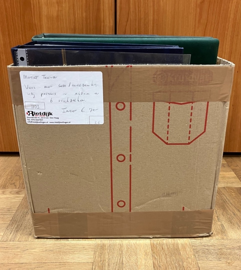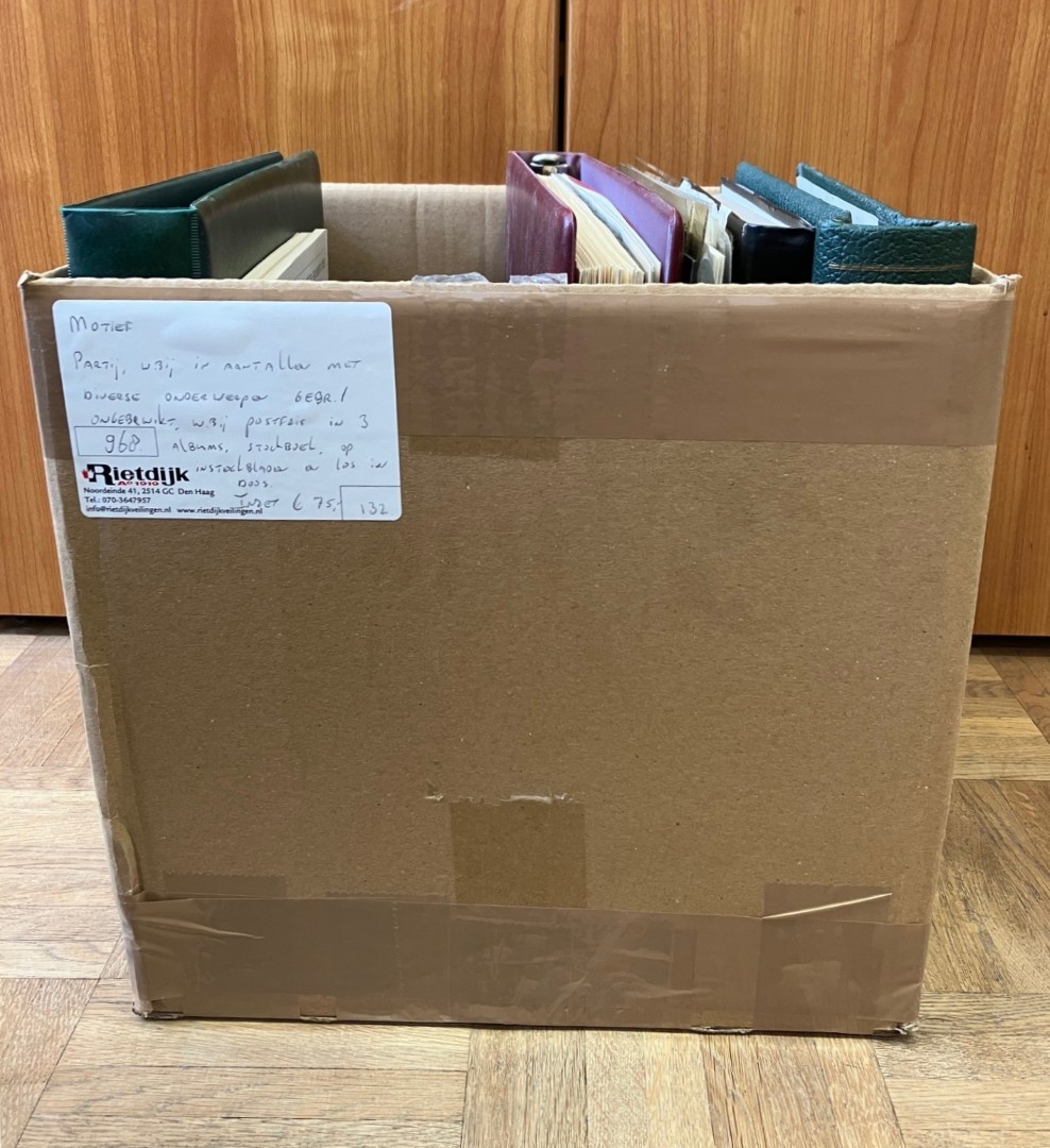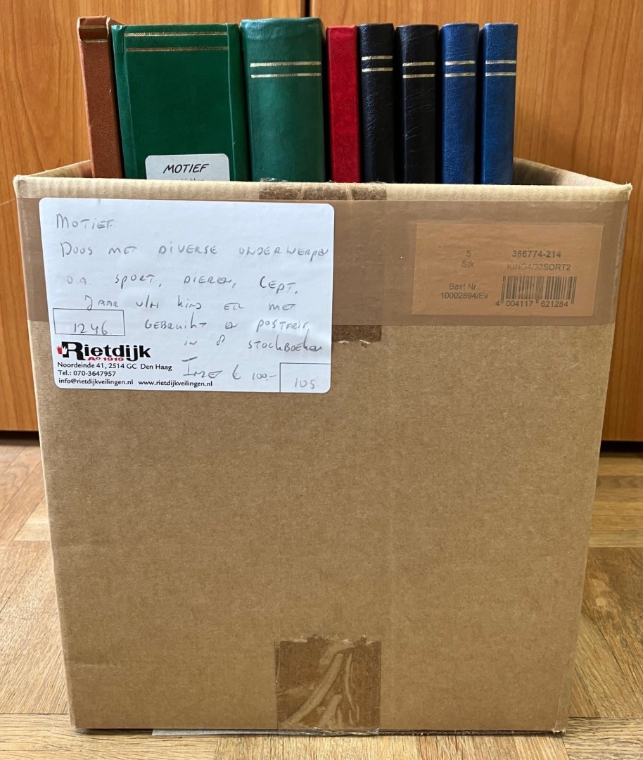 Doos met diverse onderwerpen o.a. sport, dieren, Cept, jaar v/h kind, etc. met gebruikt en postfris in 8 stockboeken. Click this link for additional images and