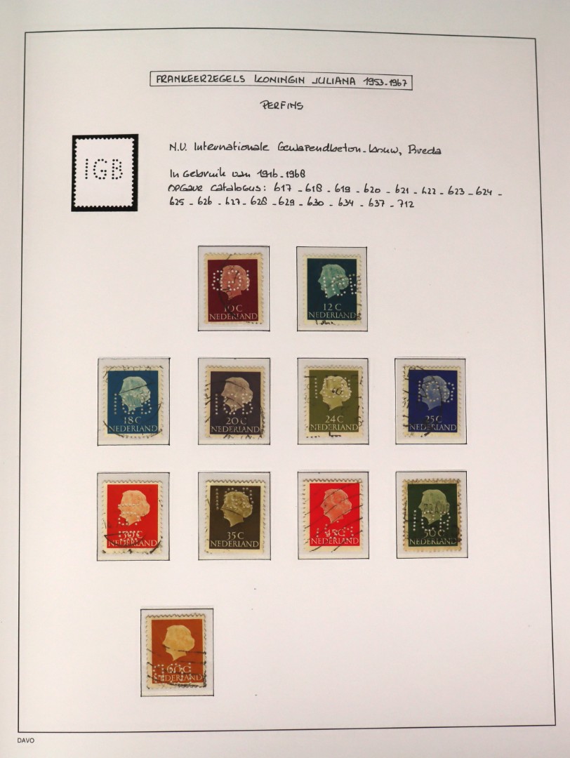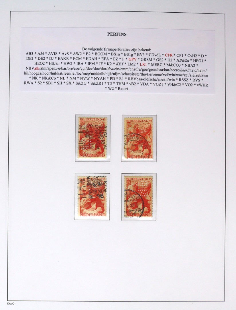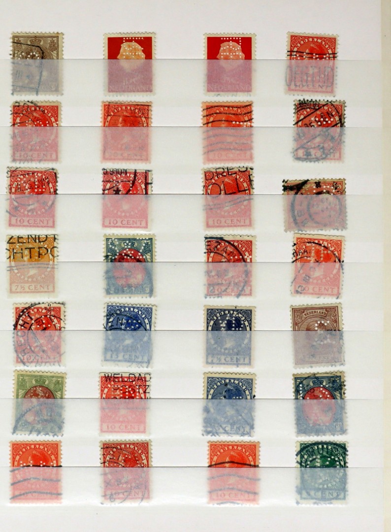 Firmaperforaties. Verz. perfins opgezet op zegelnummer tussen nr. 277 en 1053 op blanco bladen. Totaal 210 stuks. Leuke koop! Click this link for additional images and