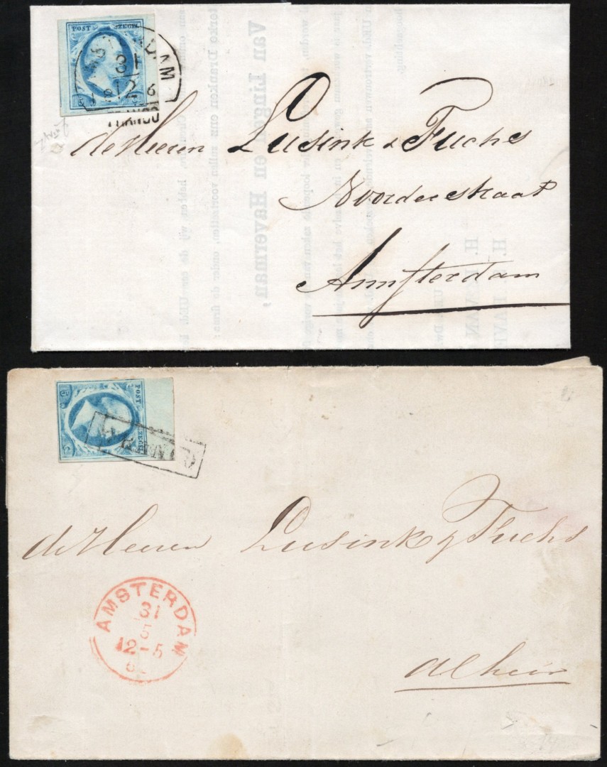 Emissie. Map met 16 vouwbrieven of omslagen gefrankeerd met nr. 1 (8 ex., w.bij 1 met paar) en nr. 2 (8 ex.). Click this link for additional images and