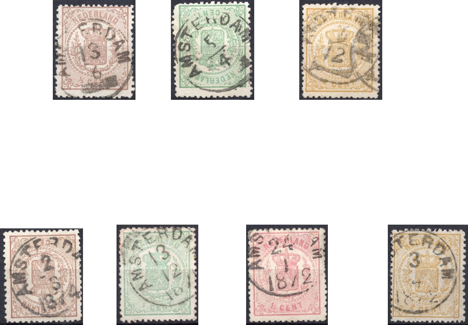 Stempels. Insteekkaart met 7 rondstempels Amsterdam met jaartal of blokje (= 1873) alle op emissie Rijkswapen. (Image)