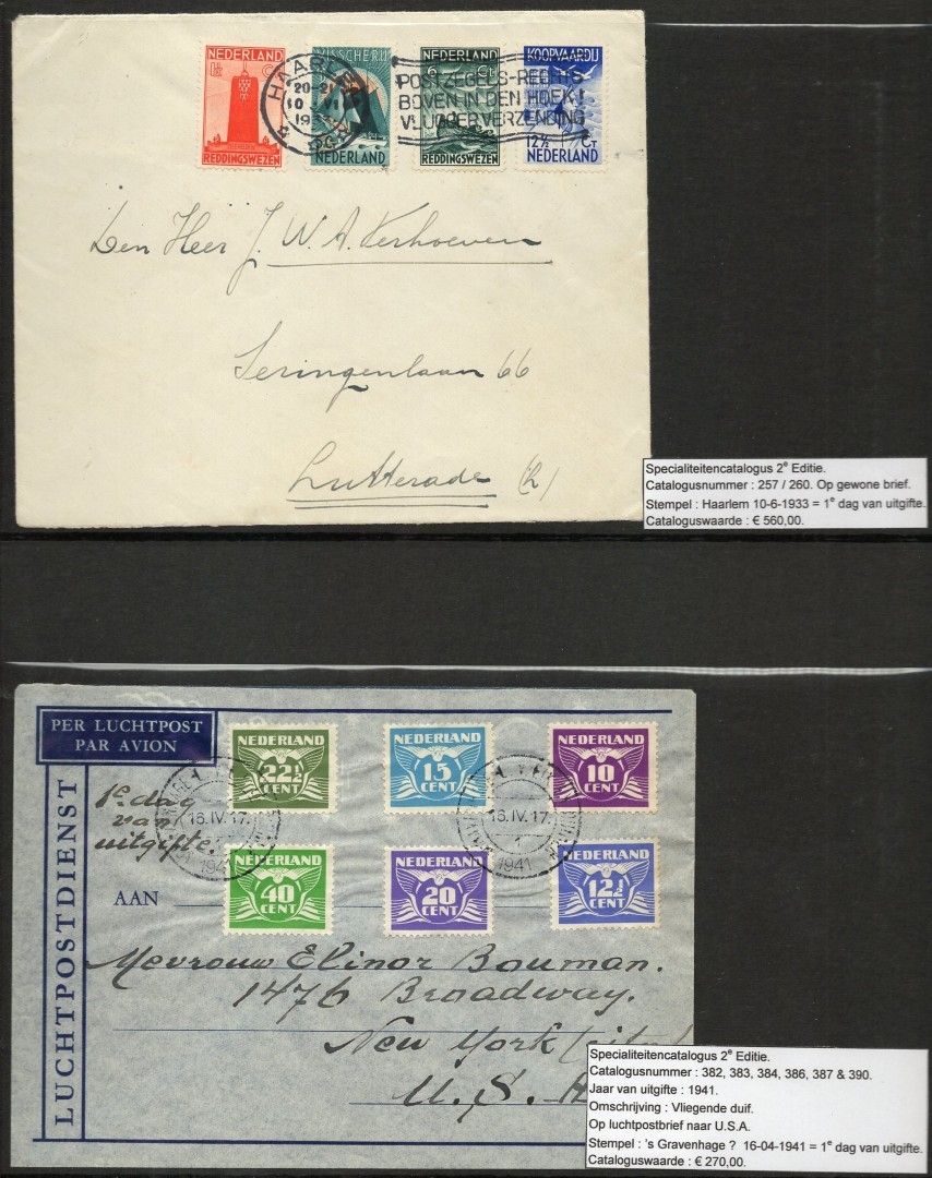 [1932-1953]. Map met 5 poststukken/covers gebruikt op 1e dag van uitgifte met o.a. 257-260 op envelop en 382, 383, 384, 386, 387 en 390 op envelop. Tevens bijzondere vlucht met foutief stempel 1952 i.p.v. 1953. Toegevoegd Suriname nr. 297-307 op 2