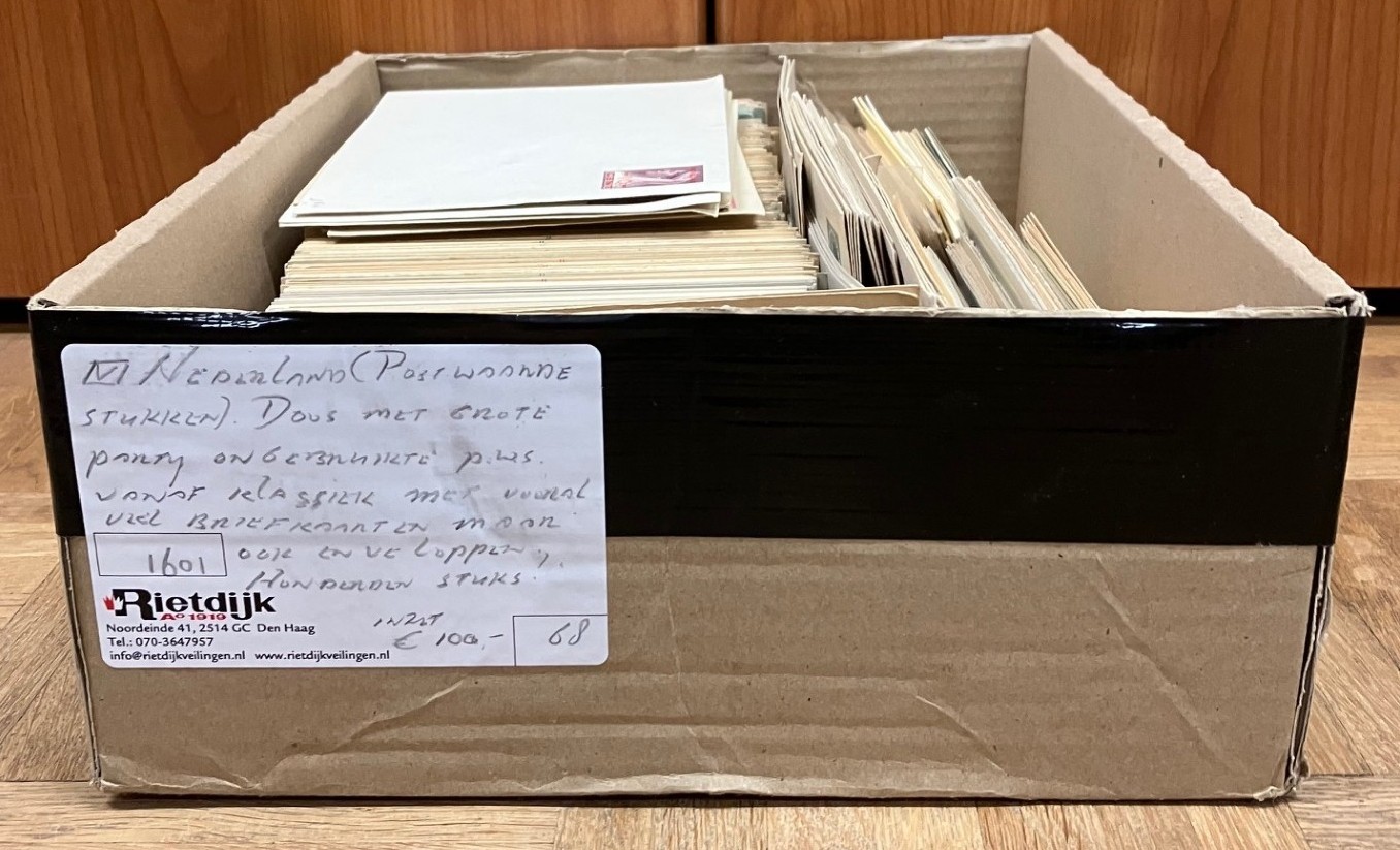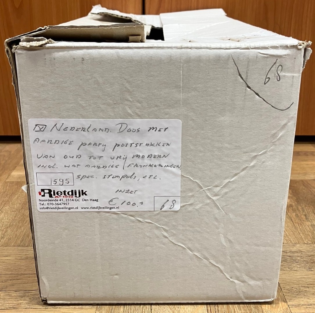 Doos met partij poststukken van oud tot vrij modern incl. wat aardige frankeringen, speciale stempels, etc. Click this link for additional images and