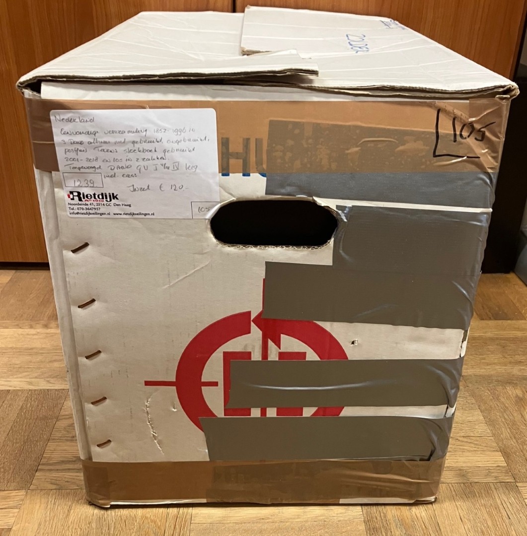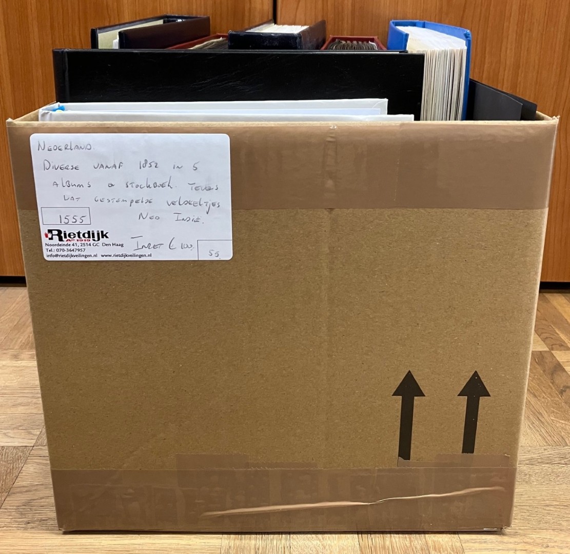 Diverse vanaf 1852 in 5 albums en stockboek in doos, w.bij ook FDC's vanaf nr. E4. Tevens wat gestempelde veldelen Ned. Indië. Click this link for additional images and