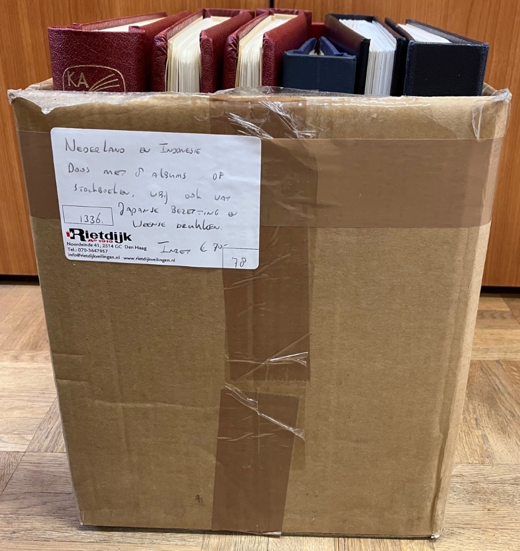 EN INDONESIË. Doos met 8 albums of stockboeken, w.bij ook wat Japanse bezetting en Weense Drukken. Click this link for additional images and