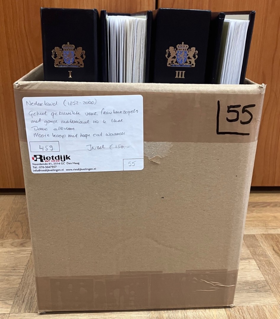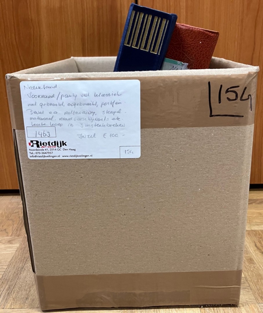 Doos met (restant)collecties vanaf 1852 in 5 albums alsmede partij in stockboek, w.bij aardig materiaal en € 300,- frankeergeldig. Click this link for additional images